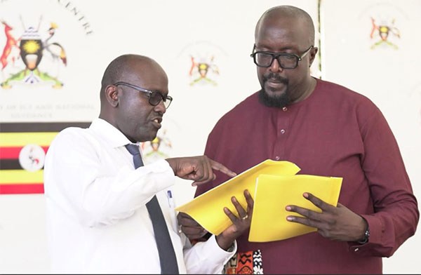 Obed Katureebe, the outgoing acting Executive Director (left) hands over status reports to Alan Kasujja during the inauguration ceremony at the Uganda Media Centre. COURTESY PHOTO/UGANDA MEDIA CENTRE.
