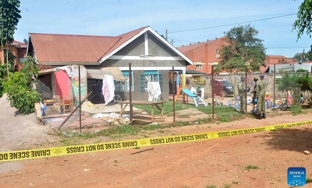 Ugandan police work at the scene where four children were killed in a stabbing incident at Ggaba Early Childhood Development Program School in Kampala, Uganda, on April 2, 2026. (Photo by Nicholas Kajoba/Xinhua)