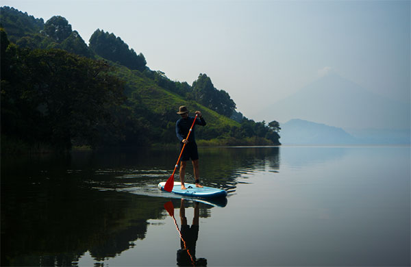 A guest of Kisoro Art Island paddles a boat on Lake Mutanda.