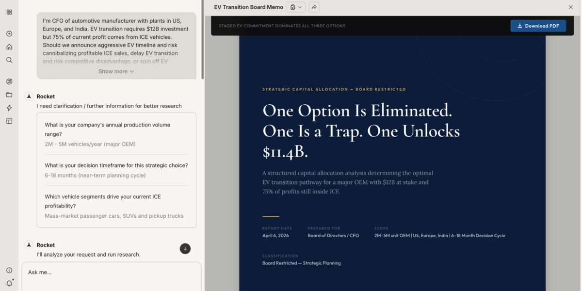 TechCrunch briefly tested Rocket’s platform ahead of its launch and found that it generated product requirement documents in PDF format from simple prompts. These documents resemble consulting-style reports rather than vibe coding tools or chatbots, which largely focus on features and execution.